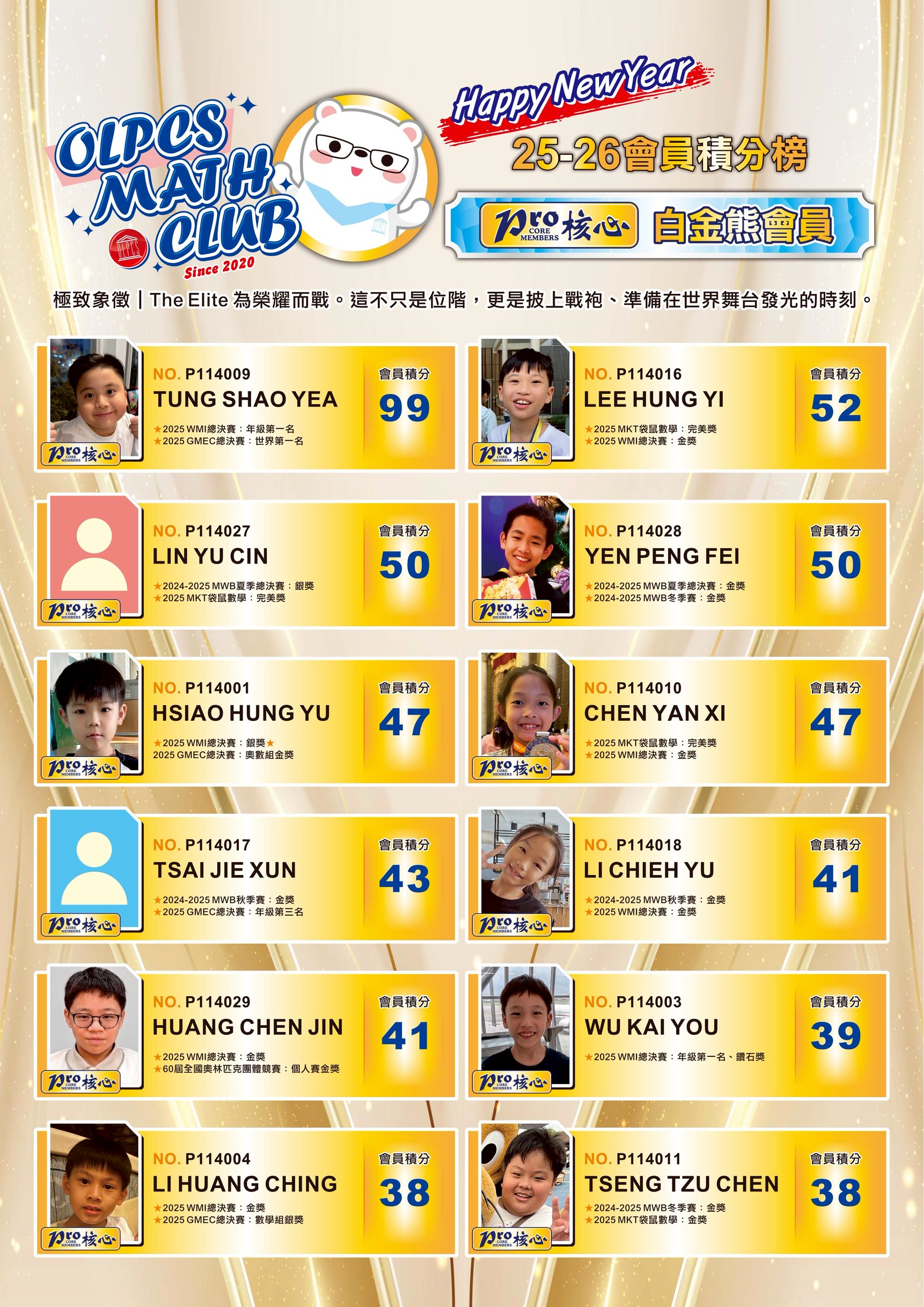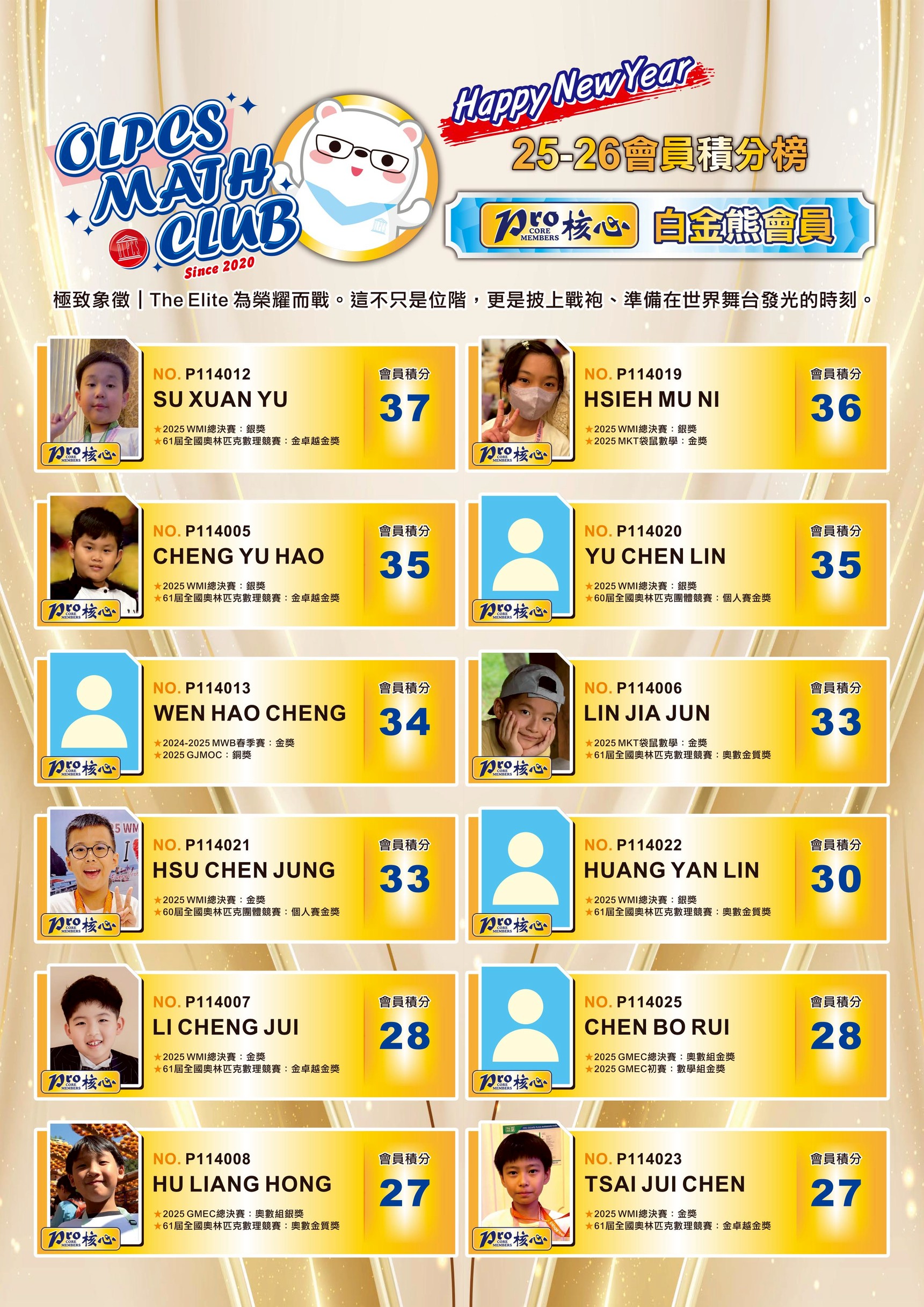 1. 俱樂部會員招收對象主要為國小高年級至高一,具國際競賽獲得金、銀獎經歷之學生。提供個人資料與獲獎,經老師評估獲准並繳交年費後,將成為核心會員。會員期間享有俱樂部競賽報名優惠,並可參與不定期課程、線上聚會,與老師及同儕研討數學國際競賽或國際檢定主題等福利。