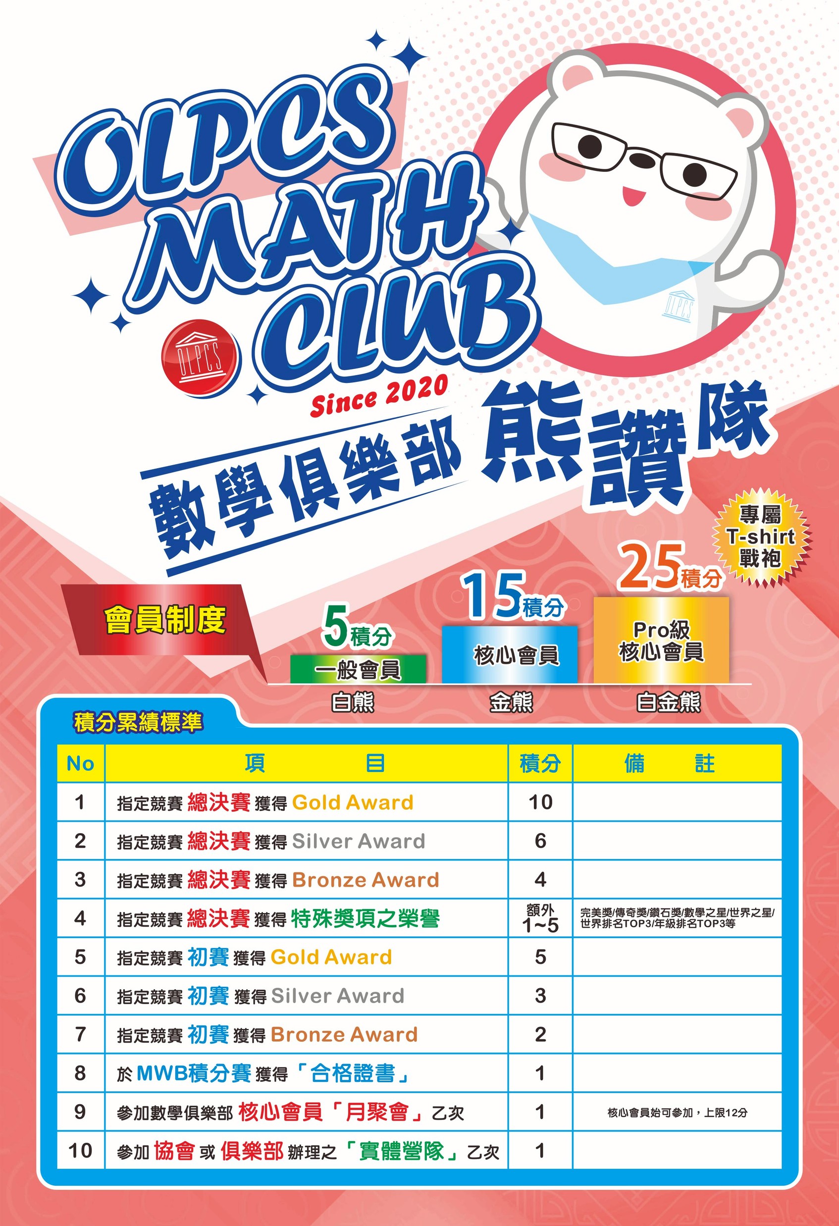 2. 透過參加中華數學協會或數學俱樂部競賽獲獎,或參與相關實體營隊,即可累積積分後免費申請為核心會員。會員資格以一年為單位,每年8月31日積分將重新計算,積分計算方式請參考以下附圖。